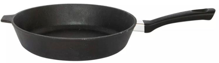 Незаменимая помощница на кухне - классическая сковорода, идеально подходящая и для жарки, и для тушения. Чугунную посуду необходимо подготовить перед первым использованием, а именно прокалить. В процессе прокаливания выгорает минеральное масло, которым пропитаны новые чугунные изделия. Он предохраняет изделие от появления коррозии (ржавчины). Процесс прокаливания пошагово прописан в инструкции по эксплуатации. Чугунная сковорода с бакелитовой ручкой подходит для готовки в домашних условиях.