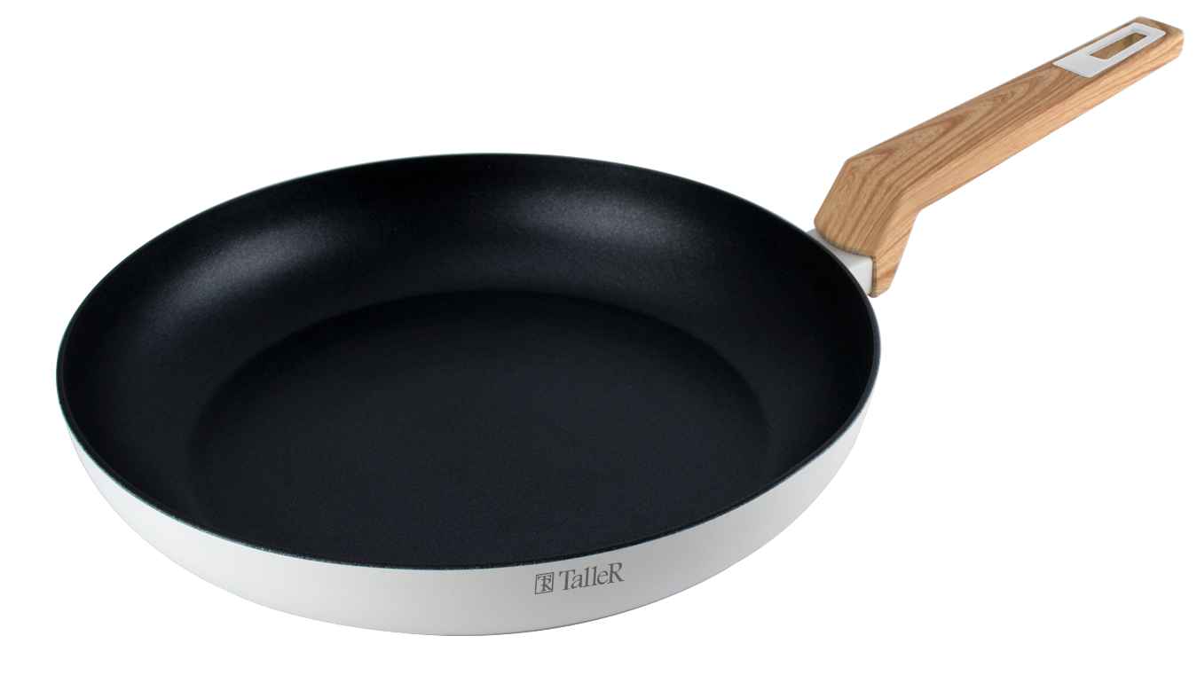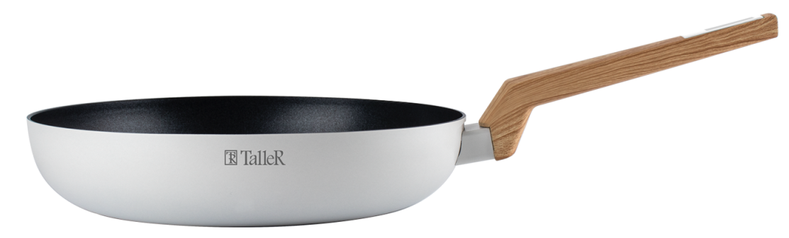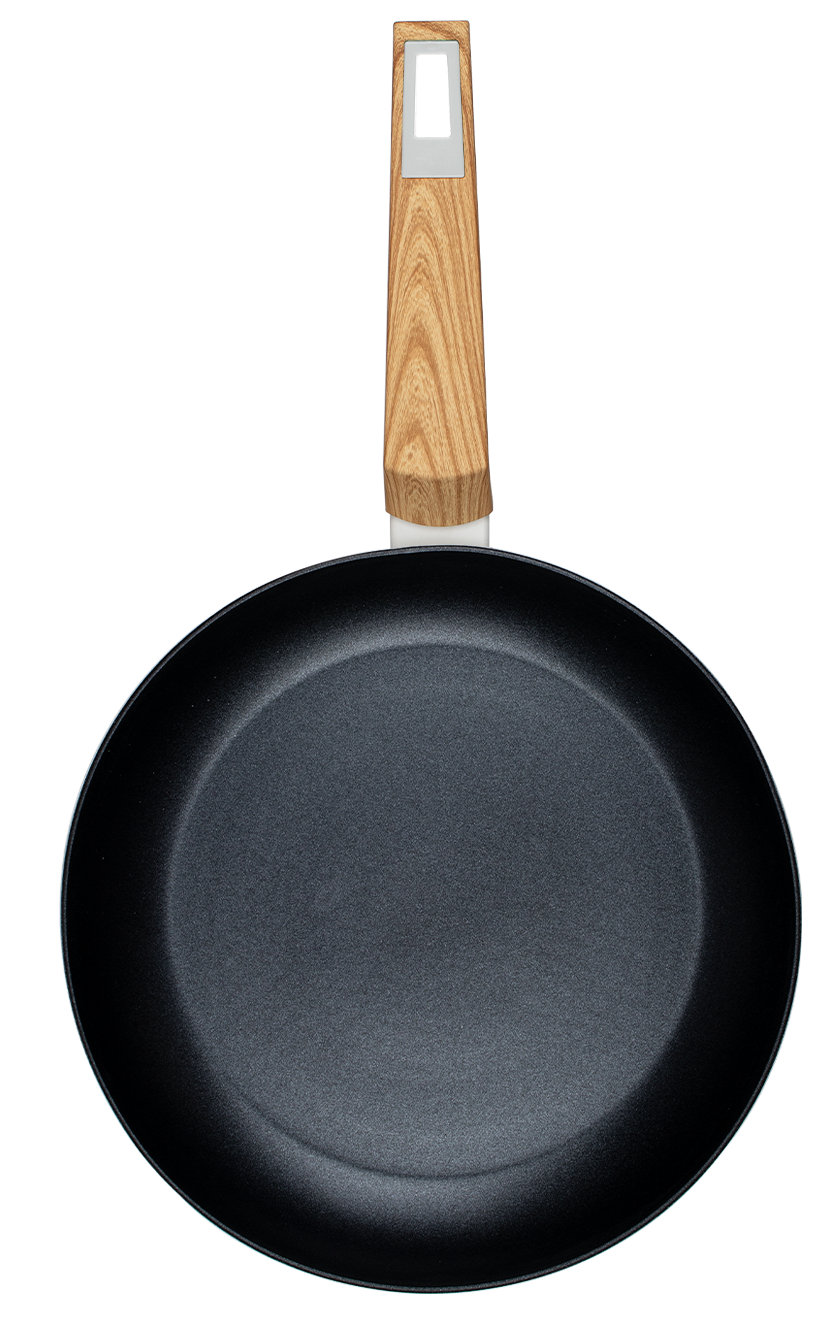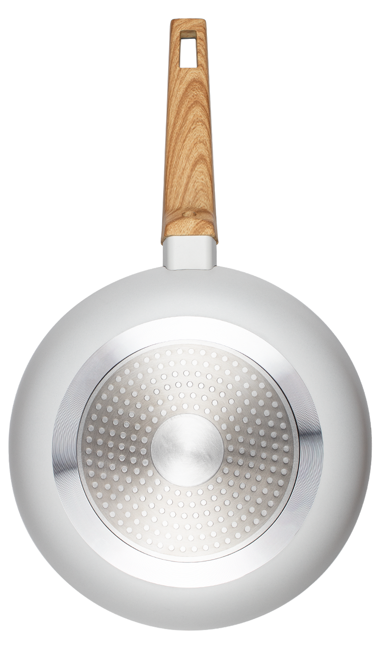 Сковорода выполнена из штампованного алюминия. Бакелитовая ручка с покрытием Soft-Touch. Дно толщиной 3 мм обеспечивает быстрый и равномерный нагрев и защищает от деформации при правильном использовании. Антипригарное покрытие не содержит PFOA.