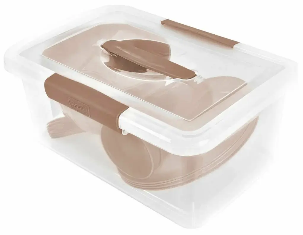 Набор для пикника рассчитан на организацию отдыха на открытом воздухе. Удобный и стильный набор посуды для пикника на 4 персоны незаменимая вещь в поездке за город. Вся посуда свободно помещается в контейнер, который имеет ручку и защелки. Благодаря удобной ручке, набор удобно переносить, а защелки обеспечивают надежное хранение.